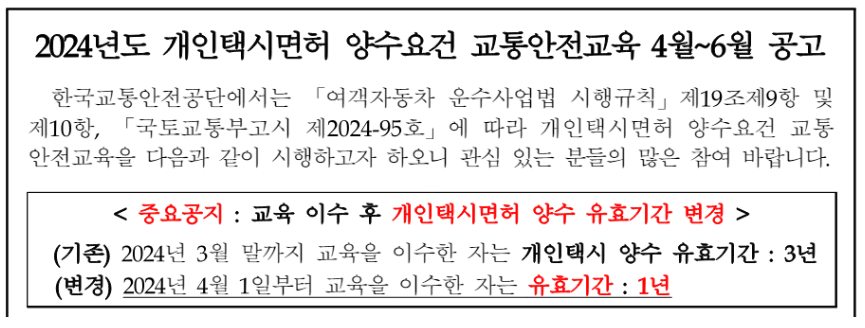 - 교육 유효기간: 2024년 4월 1일부터 교육 이수일로부터 1년 이내에 개인택시 면허를 양수해야 합니다. 1년이 경과하면 교육을 다시 이수해야 하므로, 계획을 세울 때 유의하시기 바랍니다.