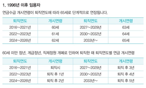 국민연금은 지속해서 개시 연령이 늦추어지고 있는데 정년을 조절하지 않않을 경우 월 소득이 갑자기 뚝 끊기게 되기 때문입니다. 이는 공무원도 마찬가지 입니다.
