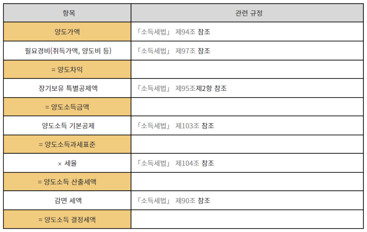 양도소득세를 계산할 때는 양도가액에서 필요경비와 양도소득 기본공제를 빼준 다음 세율을 곱해주면 됩니다. 다만 아래와 같은 계산기를 이용할 경우 정확한 세금 계산을 할 수 있습니다.
