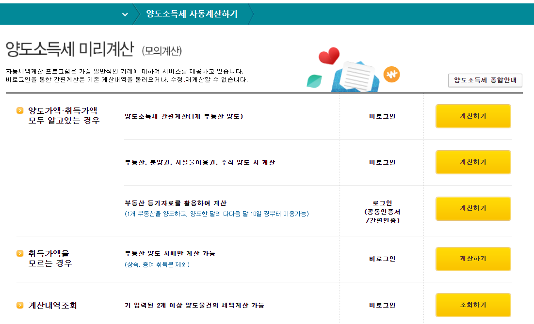 해당 양도소득세 자동계산기는 국세청 홈택스에서 제공되는 계산기로 가장 최신의 정보로 적용되어 있어 가장 신뢰할 수 있습니다.