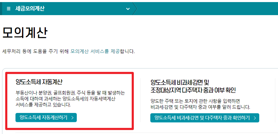 위 버튼을 클릭하면 양도소득세 자동계산을 할 수 있는 계산기로 이동됩니다.