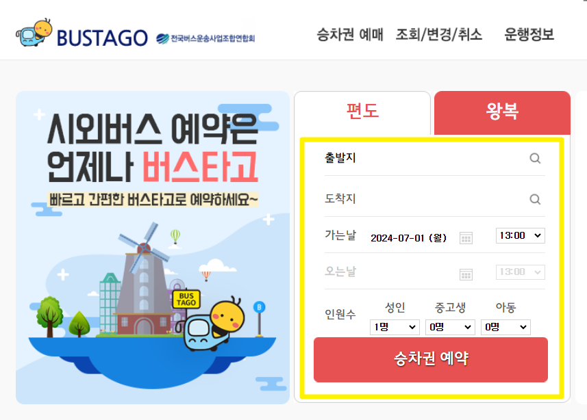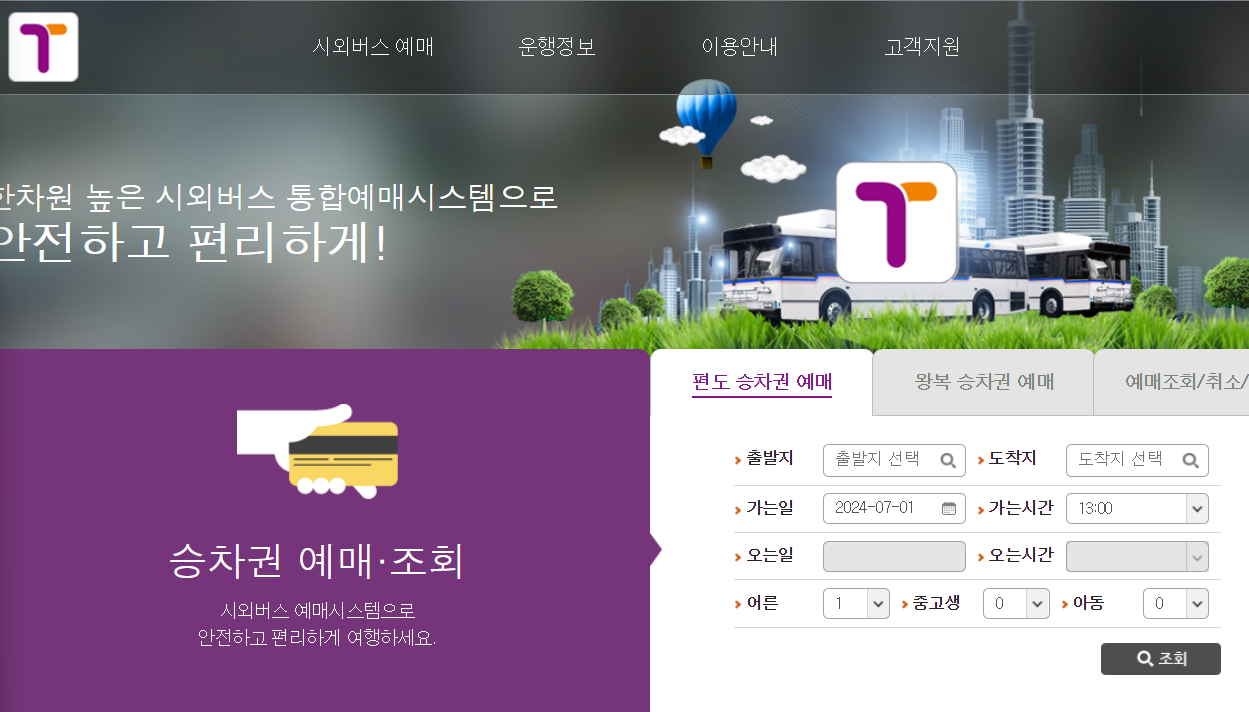 해당 사이트는 전국의 모든 버스 예약을 할 수 있어 인천공항버스 예매 또한 가능합니다. 출발지와 도착지, 그리고 가는날을 입력하여 승차권을 예약할 수 있으며, 왕복일 경우 옆 탭으로 이동하시어 이용하시기 바랍니다.