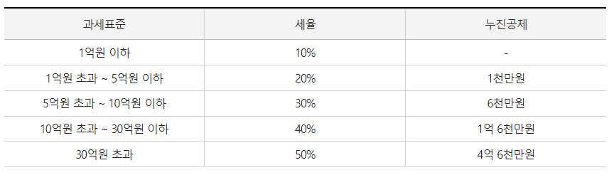 상속받을 재산이 5억원이라면 누진공제액 1천만원을 제하고 남은 과세표준에 세율이 곱해져서 계산이 됩니다.