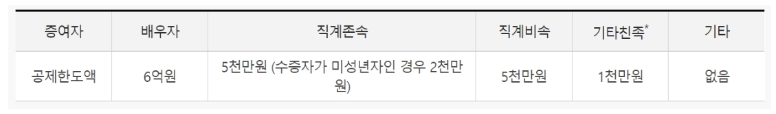 특히 자녀가 많을 수록 한 자녀당 5천만원의 면제한도액이기 때문에 이럴 경우 상속세 부담을 줄이는 데 큰 도움이 됩니다. 또한 면제한도액은 사망한 사람과 어떤 관계이냐에 따라 면제 한도액이 달라지게 됩니다.