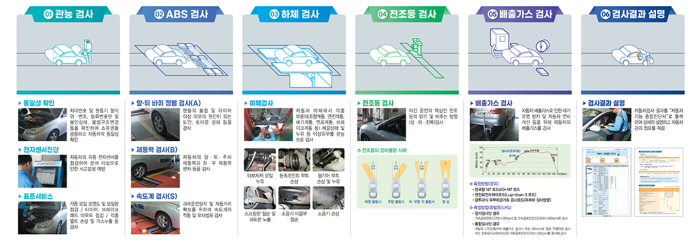 자동차 정기검사는 보통 엔진, 브레이크, 조향장치, 타이어, 배기가스 등이 포함되며 이 항목에 대해 또 세부적인 점검이 이루어집니다.