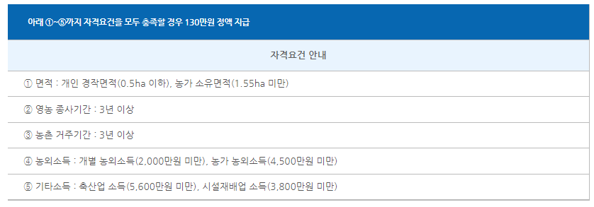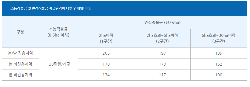 - 소농직불금 : 농지 면적이 0.5ha 이하인 소규모 농가를 대상으로 지급(정액제)