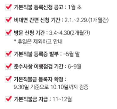 보통 직불금 신청시기는 대면 신청과 비대면 신청이 각각 이루어집니다. 매해 2월달에 홈페이지를 통해 신청할 수 있기 때문에 이 기간을 놓치지 마시기 바랍니다.