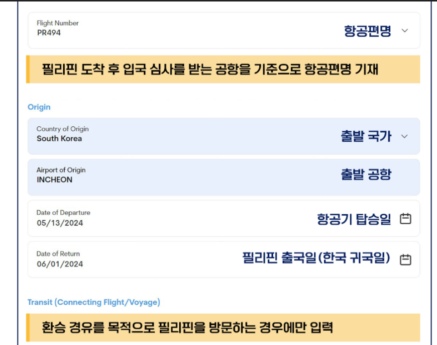 이 처럼 입국신고서를 등록할 때 항공편명 외 개인정보말고도 여행 정보 등이 필요합니다. 따라서 필리핀 여행 전 가장 마지막 단계에 이 처럼 이트래블을 작성해주면 되는 것 입니다.