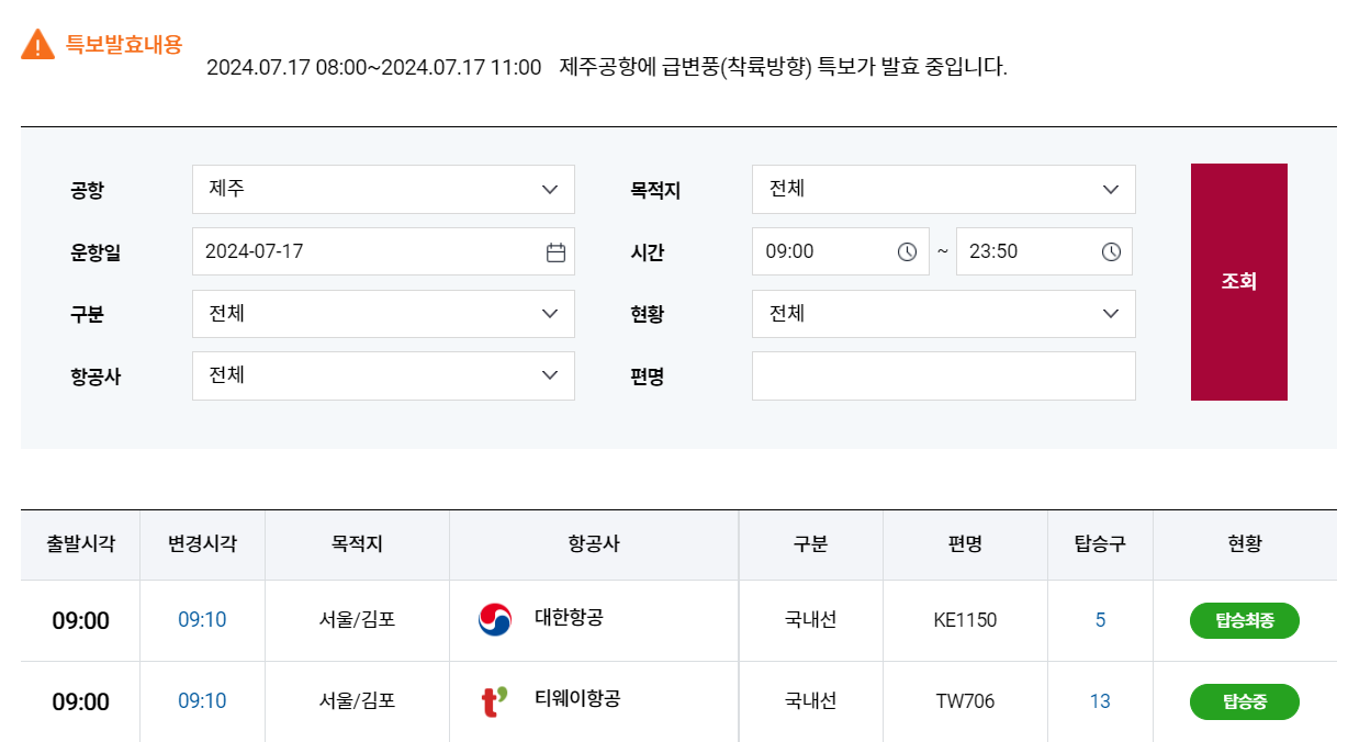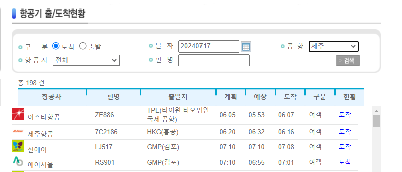 오른쪽 [공항]을 '제주'로 바꾸어준 다음 내가 출발하는 비행기 정보를 입력하면 현황 부분에 도착인지, 지연인지, 결항인지 확인이 가능합니다.